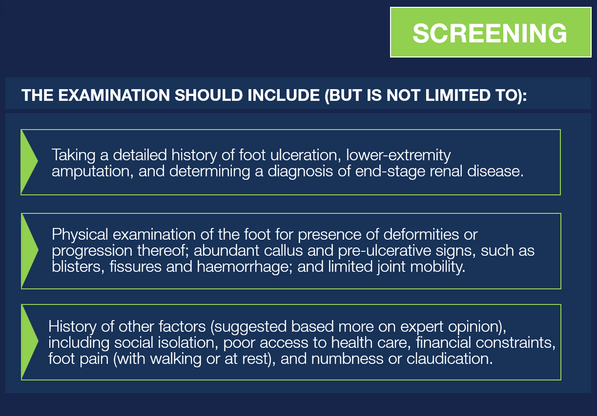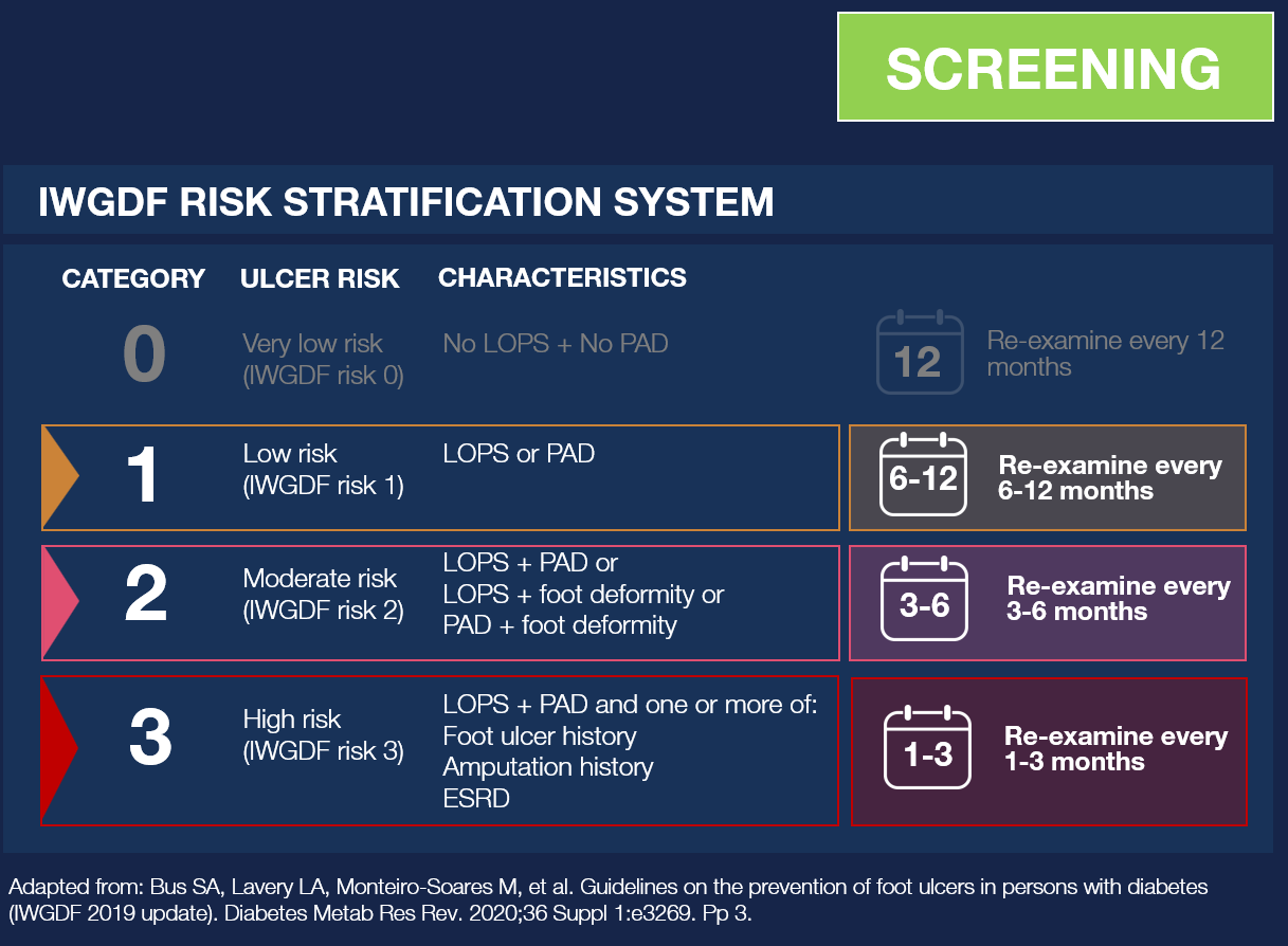 More extensive and more frequent foot examination is needed, as the ulcer risk is higher. Based on the ulcer risk and characteristics identified, determine IWGDF risk level and screening requirements.