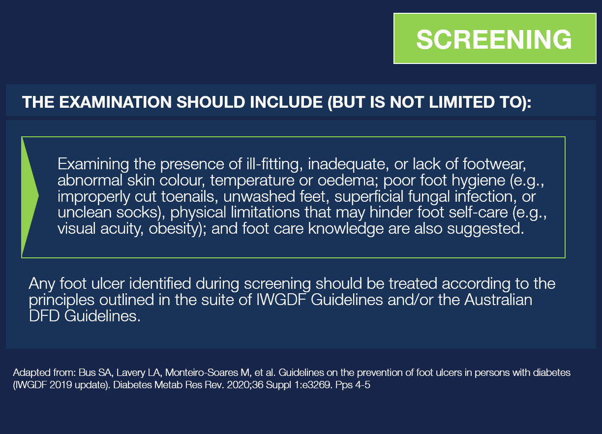 Screen a person with diabetes at risk of foot ulceration for: